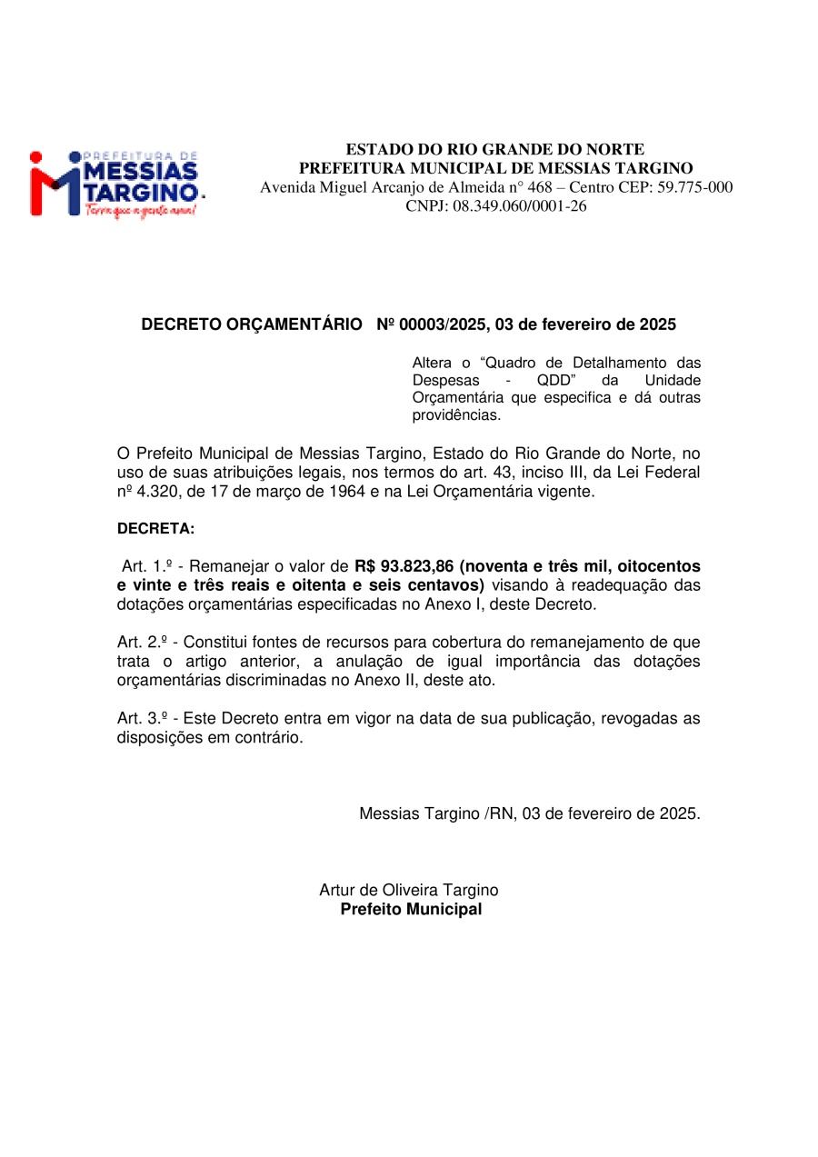 DECRETO ORÇAMENTÁRIO Nº 00003/2025, 03 de fevereiro de 2025