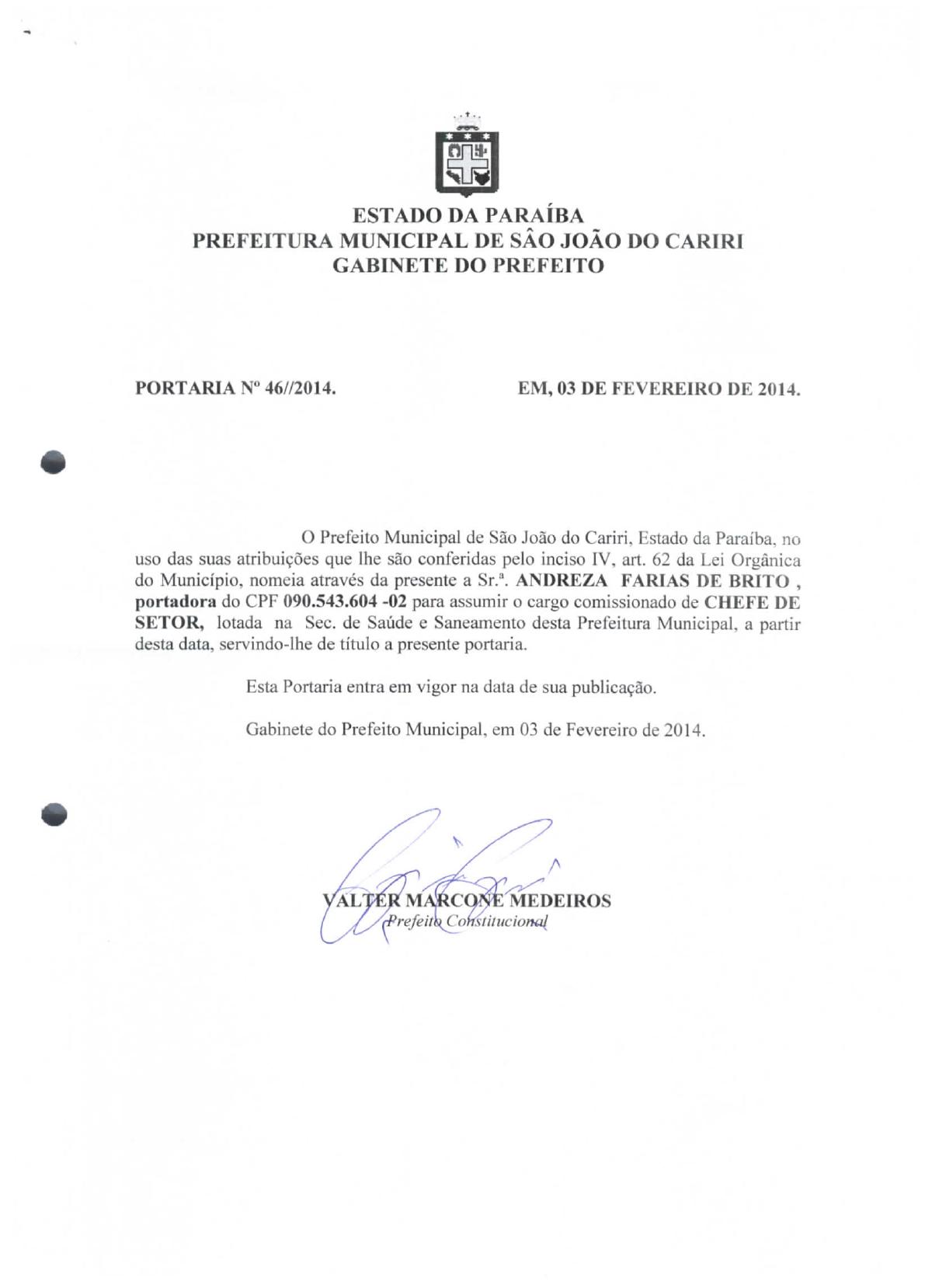 PORTARIA Nº 0046/2014 - NOMEAR ANDREZA FARIAS DE BRITO - CHEFE DE SETOR