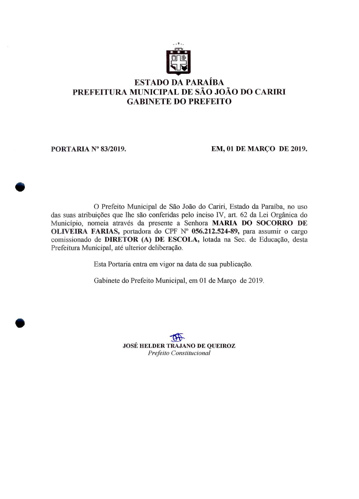 PORTARIA Nº 0083/2019 - NOMEAR MARIA DO SOCORRO DE OLIVEIRA FARIAS - DIRETOR DE ESCOLA