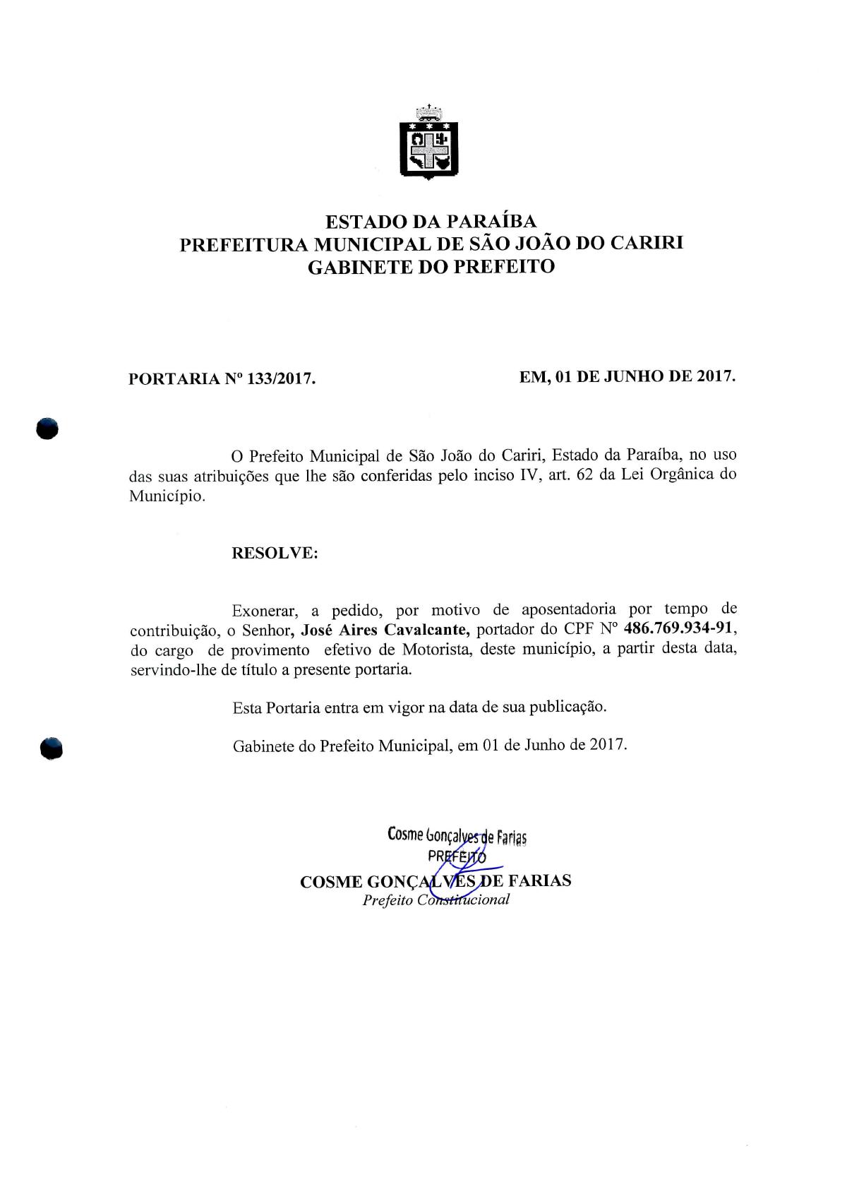 PORTARIA Nº 00133/2017 - EXONERAR A PEDIDO JOSE AIRES CAVALCANTE