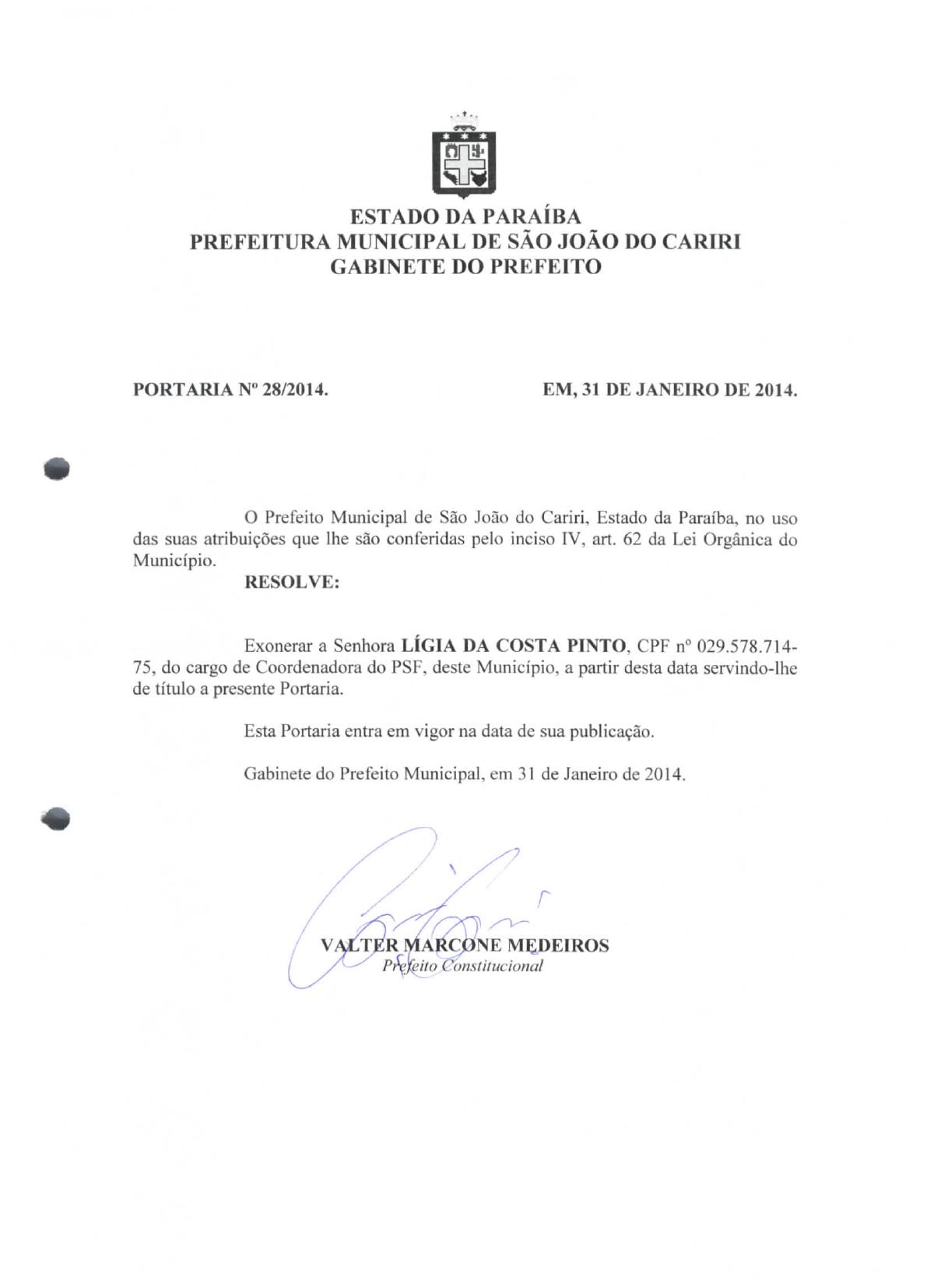PORTARIA Nº 0028/2014 - EXONERAR LIGIA DA COSTA PINTO - COORDENADORA DO PSF