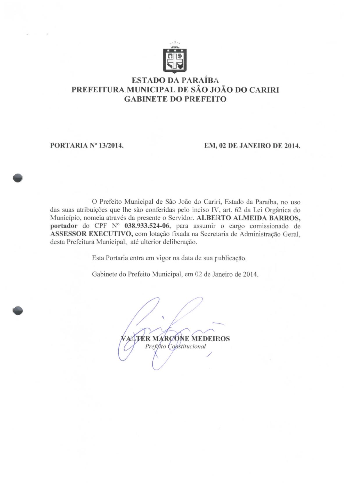 PORTARIA Nº 0013/2014 - NOMEAR ALBERTO ALMEIDA BARROS - ASSESSOR EXECUTIVO