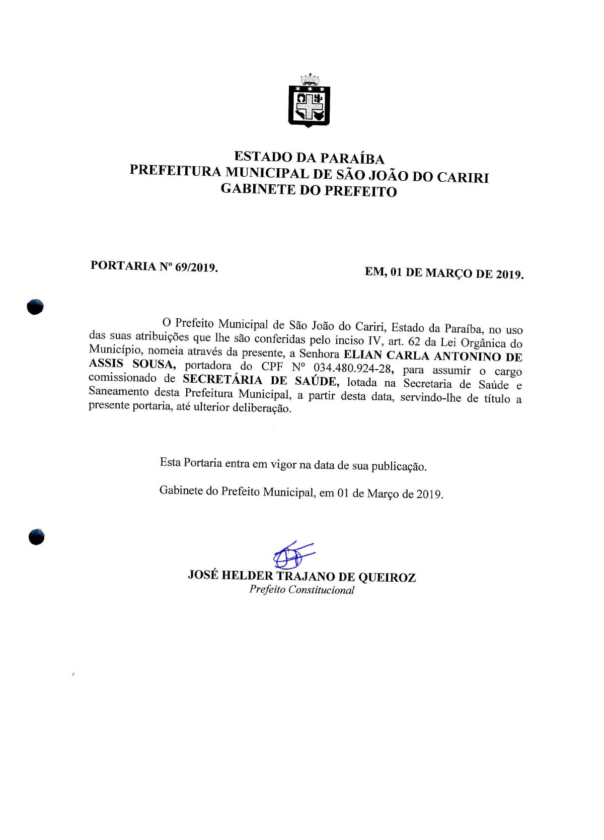 PORTARIA Nº 0069/2019 - NOMEAR ELIAN CARLA ANTONINO DE ASSIS SOUSA - SEC DE SAUDE