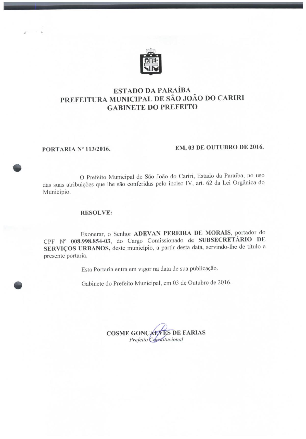 PORTARIA Nº 00113/2016 - EXONERAR ADEVAN PEREIRA DE MORAIS - SUBSECRETÁRIO DE SERVIÇOS URBANOS