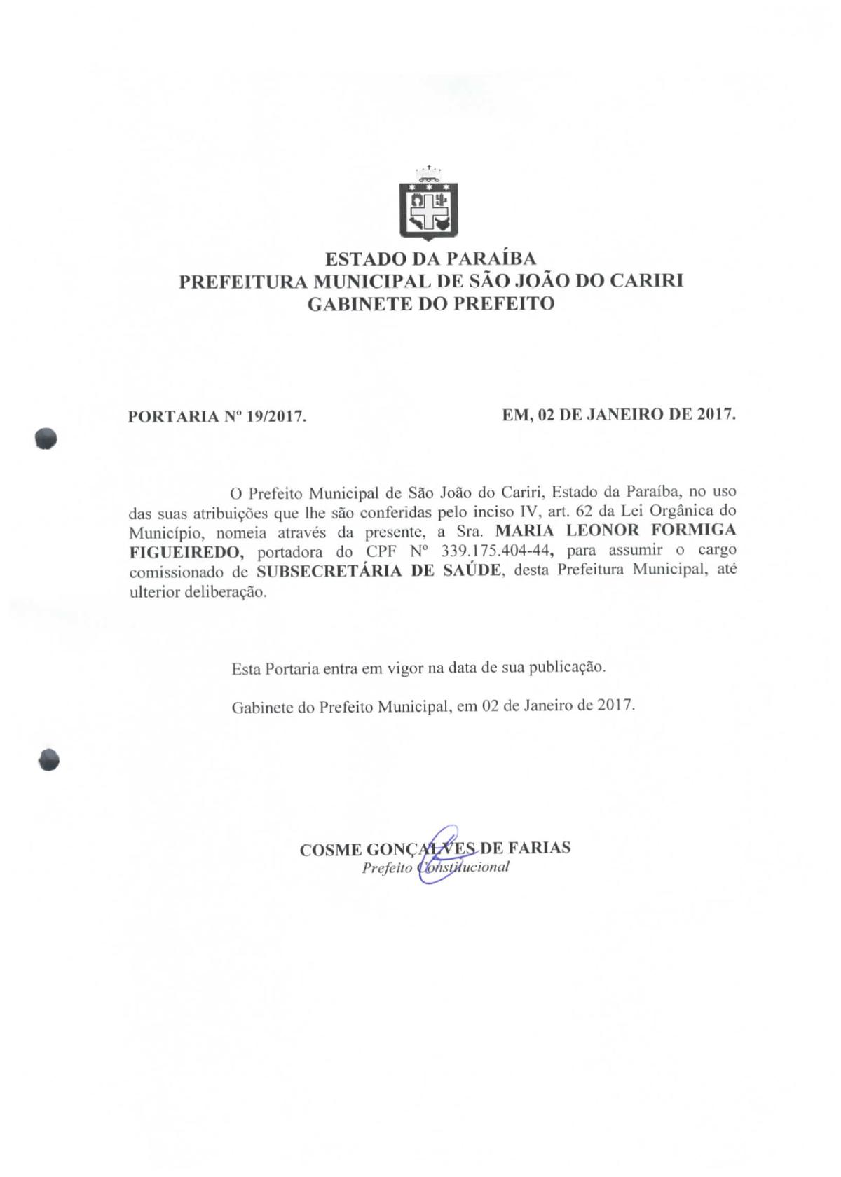 PORTARIA Nº 00019/2017 - NOMEAR MARIA LEONOR FORMIGA FIGUEIREDO - SUBSECRETÁRIA DE SAÚDE