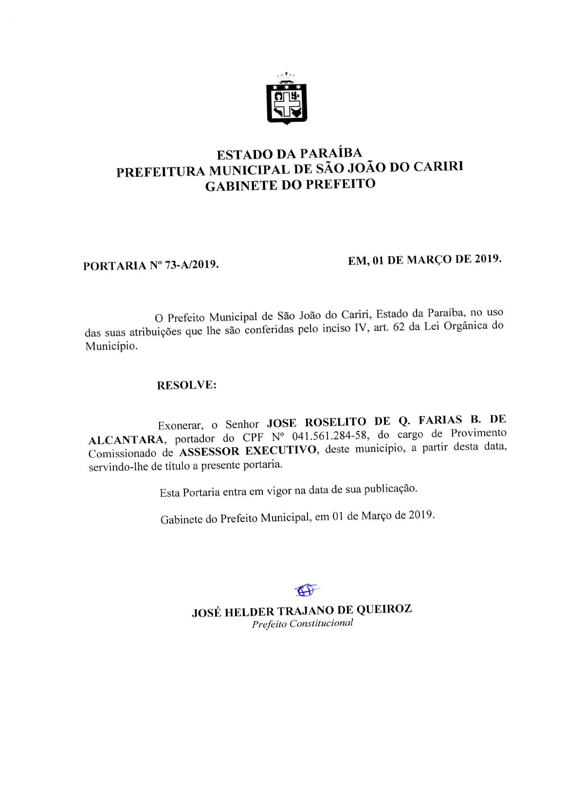 PORTARIA Nº 0073/2019-A - EXONERAR JOSE ROSELITO DE QUEIROZ FARIAS B DE ALCANTARA - ASSESSOR EXECUTIVO