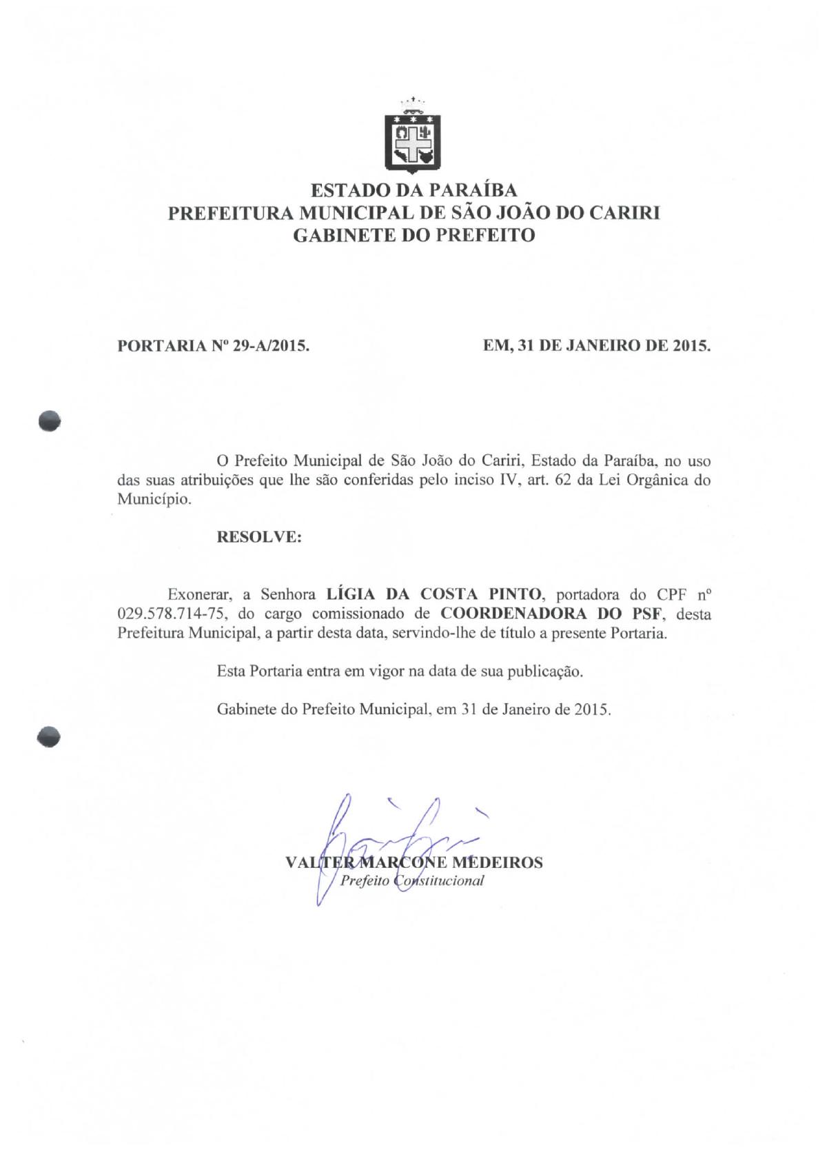 PORTARIA Nº 0029/2015-A - EXONERAR LIGIA DA COSTA PINTO - COORDENADORA DO PSF
