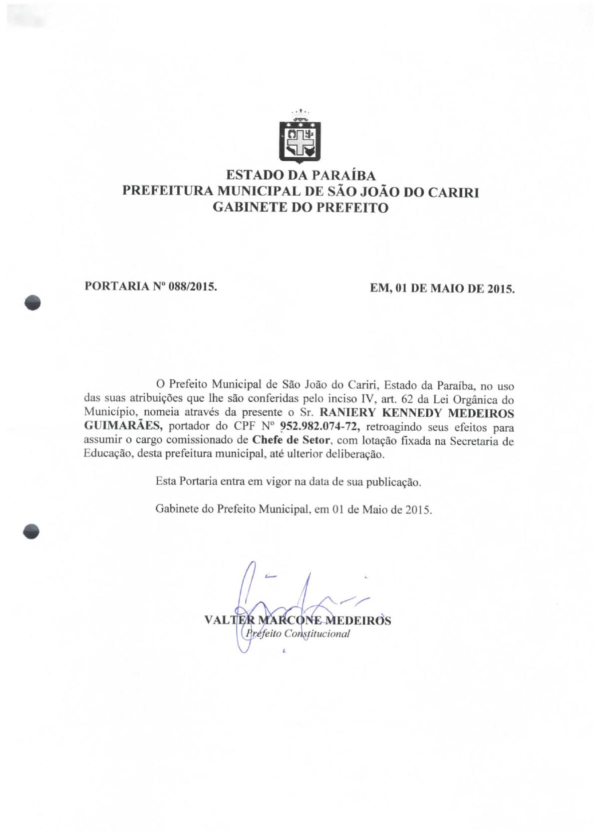 PORTARIA Nº 0088/2015 - NOMEAR RANIERY KENNEDY MEDEIROS GUIMARÃES - CHEFE DE SETOR