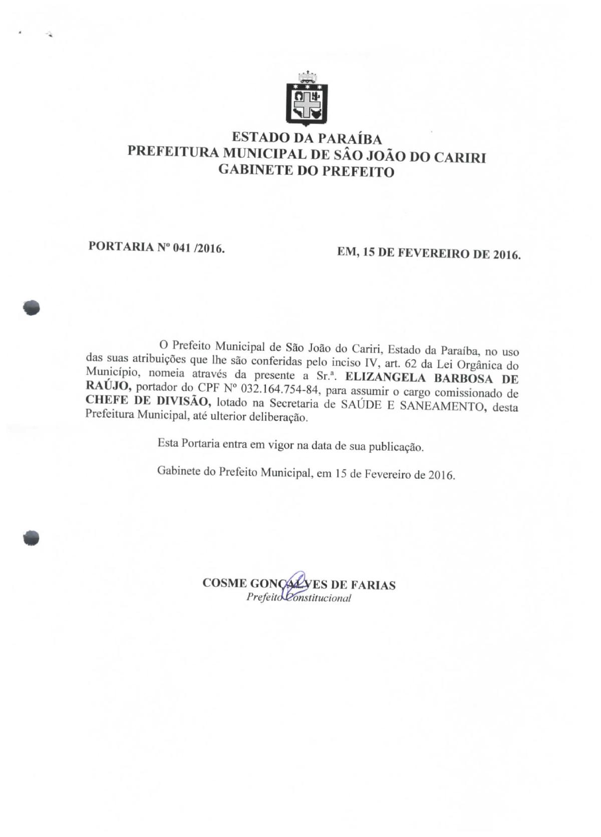 PORTARIA Nº 00041/2016 - NOMEAR ELIZANGELA BARBOSA DE ARAÚJO - CHEFE DE DIVISÃO