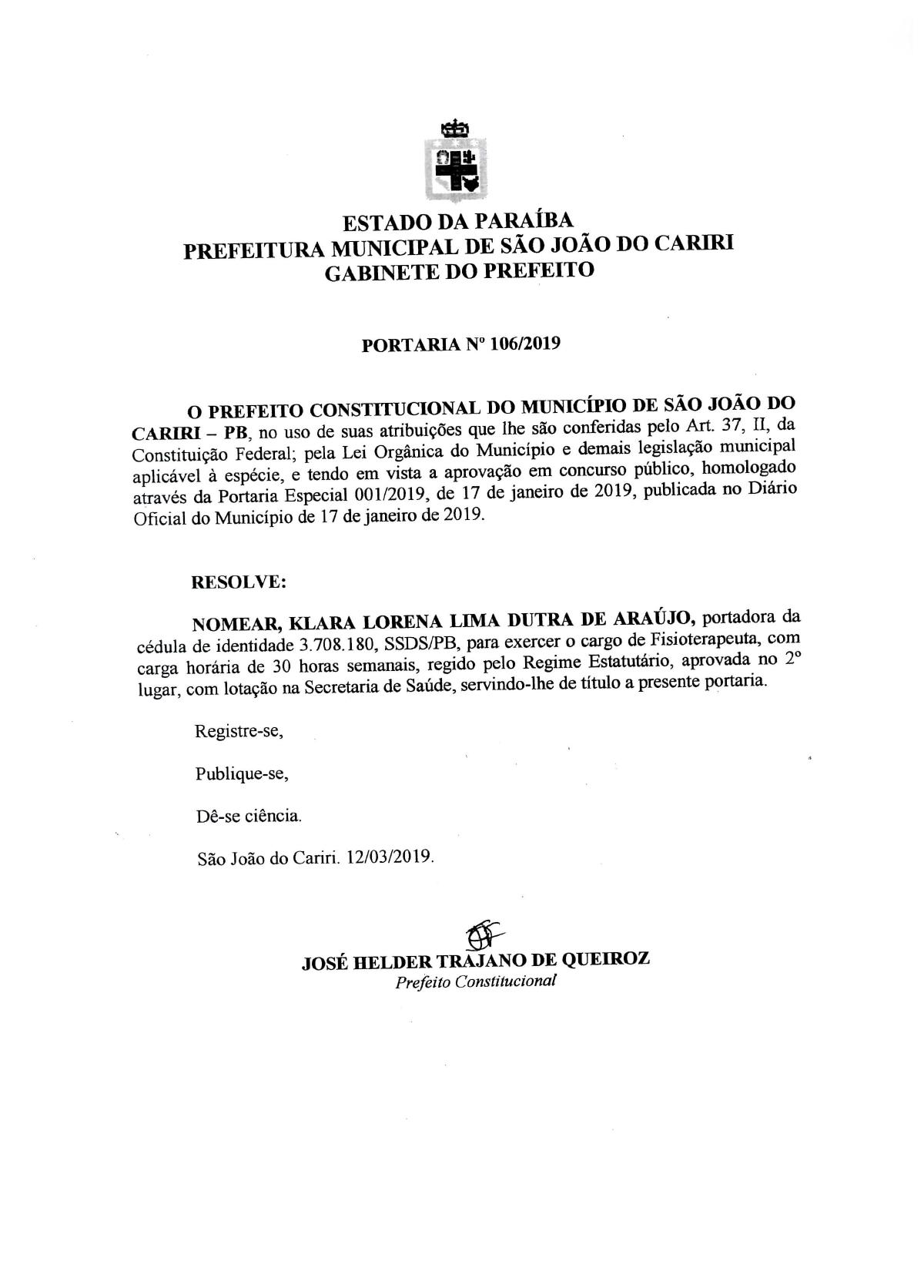 PORTARIA Nº 00106/2019 - NOMEAR KLARA LORENA LIMA DUTRA DE ARAUJO - FISIOTERAPEUTA