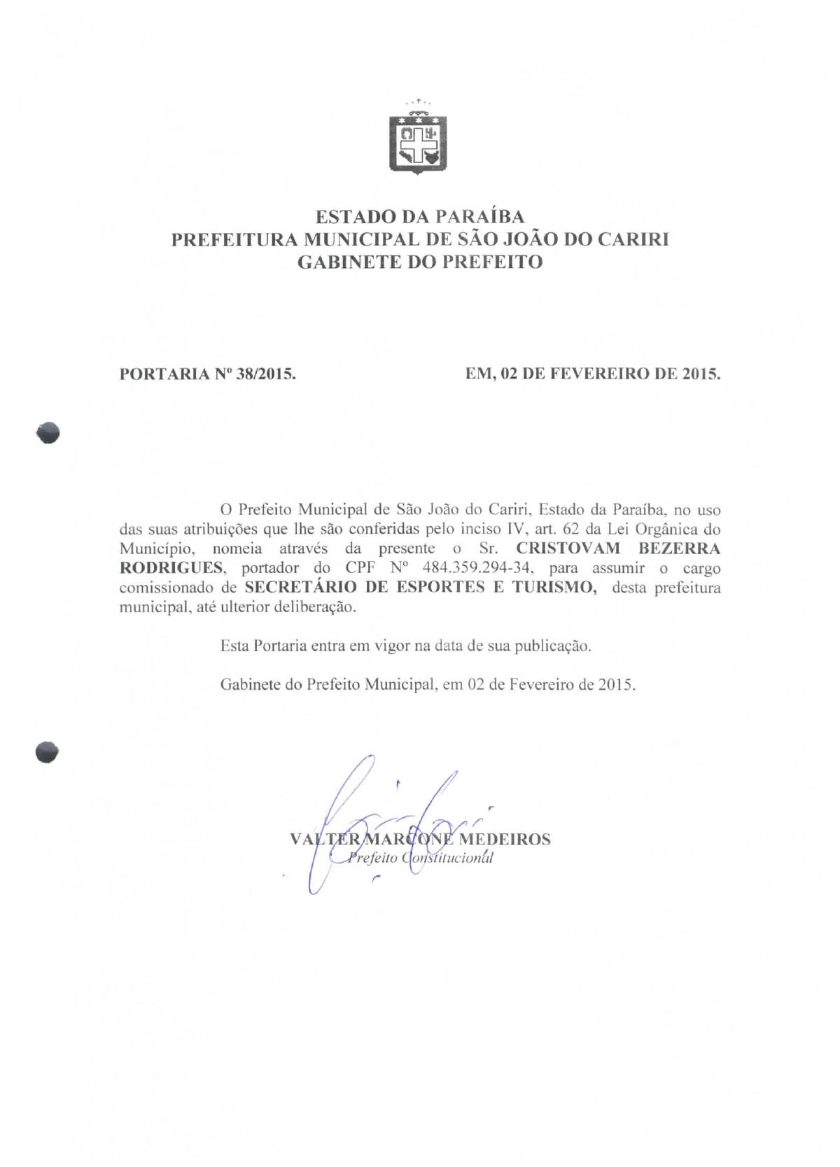 PORTARIA Nº 0038/2015 - NOMEAR CRISTOVAM BEZERRA RODRIGUES - SECRETÁRIO DE ESPORTES E TURISMO