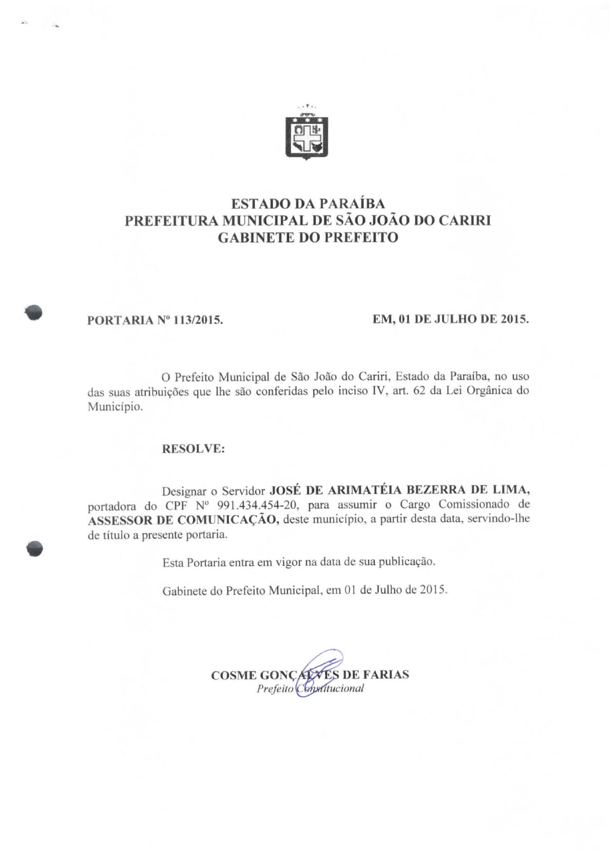 PORTARIA Nº 00113/2015 - DESIGNAR JOSE DE ARIMATEIA BEZERRA DE LIMA - ASSESSOR DE COMUNICAÇÃO