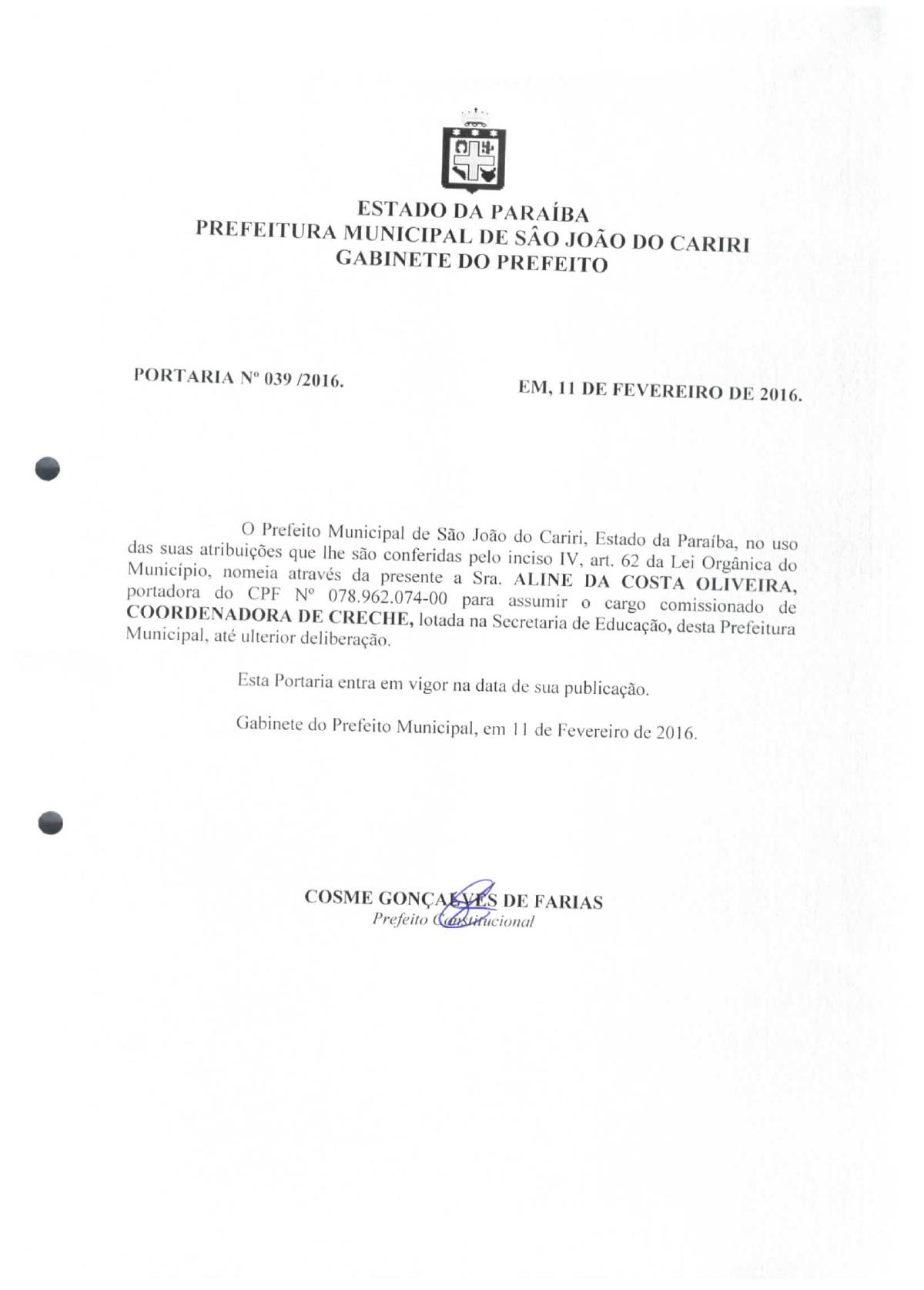 PORTARIA Nº 00039/2016 - NOMEAR ALINE DA COSTA OLIVEIRA - COORDENADORA DE CRECHE