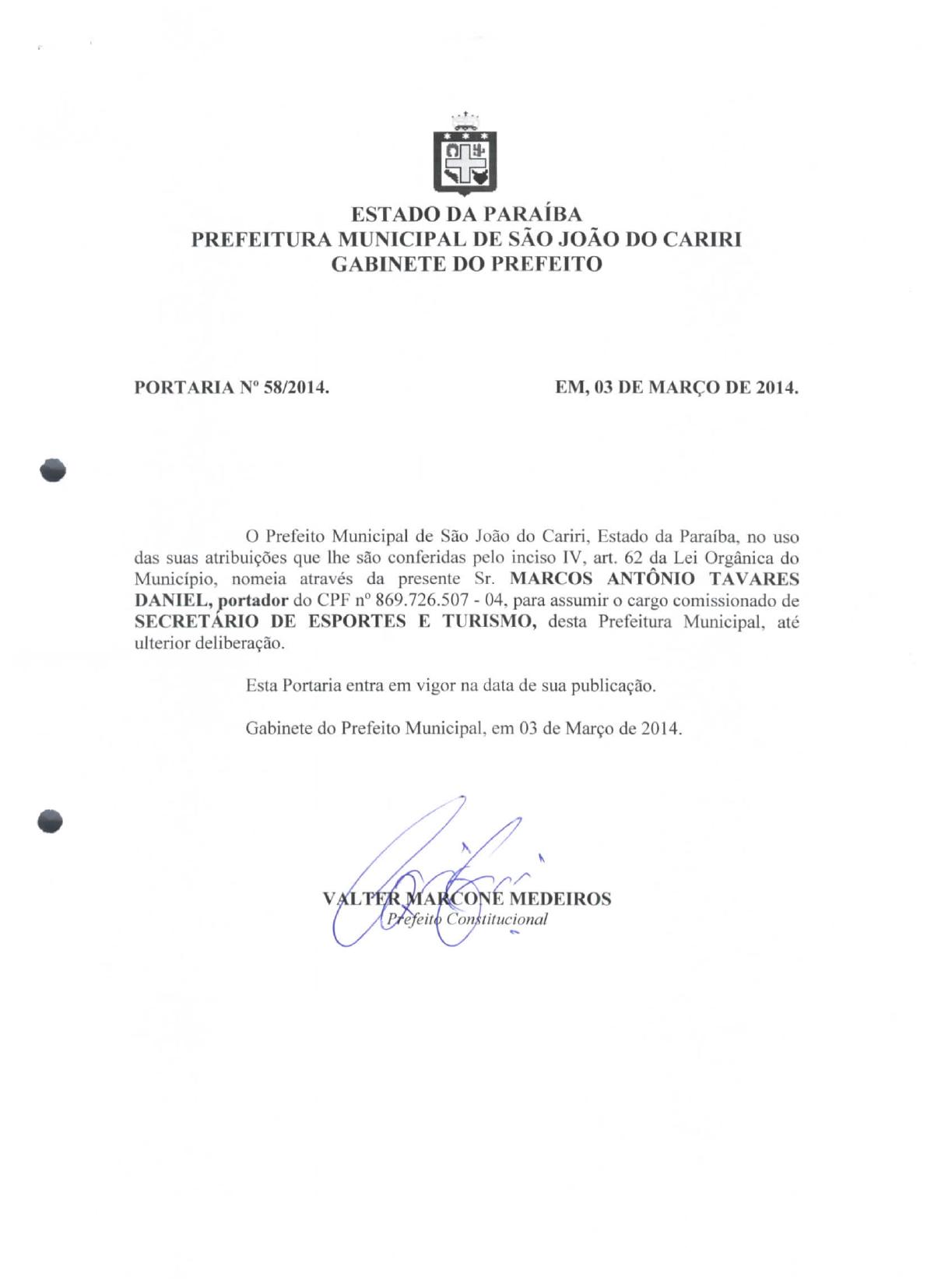 PORTARIA Nº 0058/2014 - NOMEAR MARCOS ANTONIO TAVARES DANIEL - SECRETARIO DE ESPORTES E TURISMO