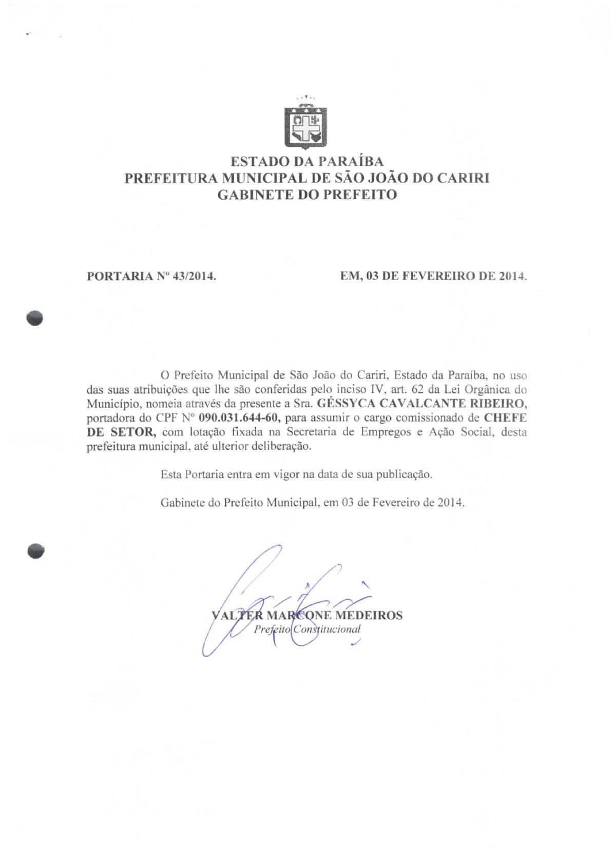 PORTARIA Nº 0043/2014 - NOMEAR GESSYCA CAVALCANTE RIBEIRO - CHEFE DE SETOR
