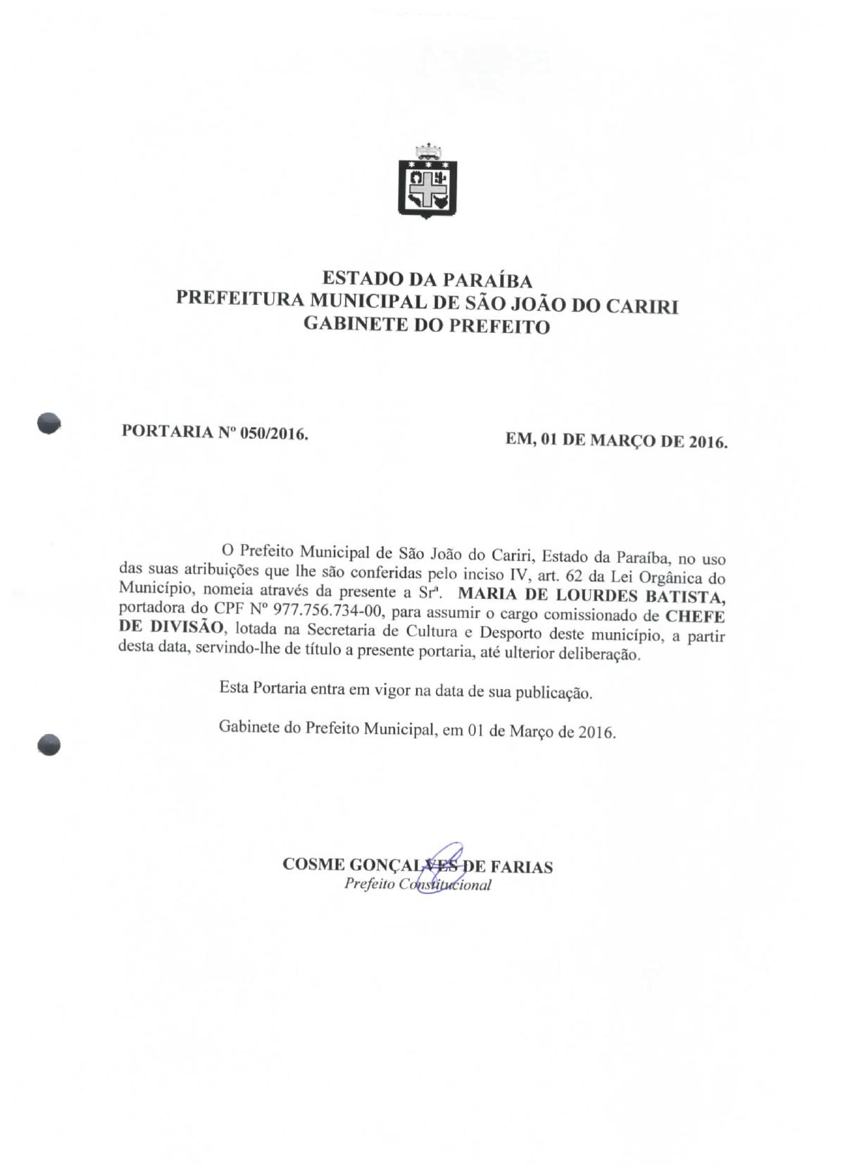 PORTARIA Nº 00050/2016 - NOMEAR MARIA DE LOURDES BATISTA - CHEFE DE DIVISÃO