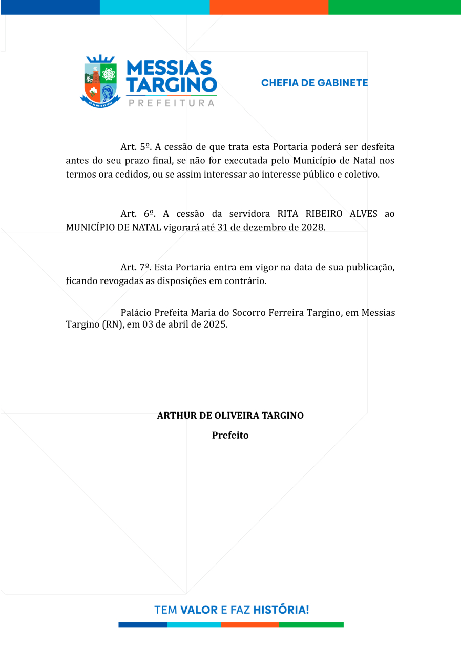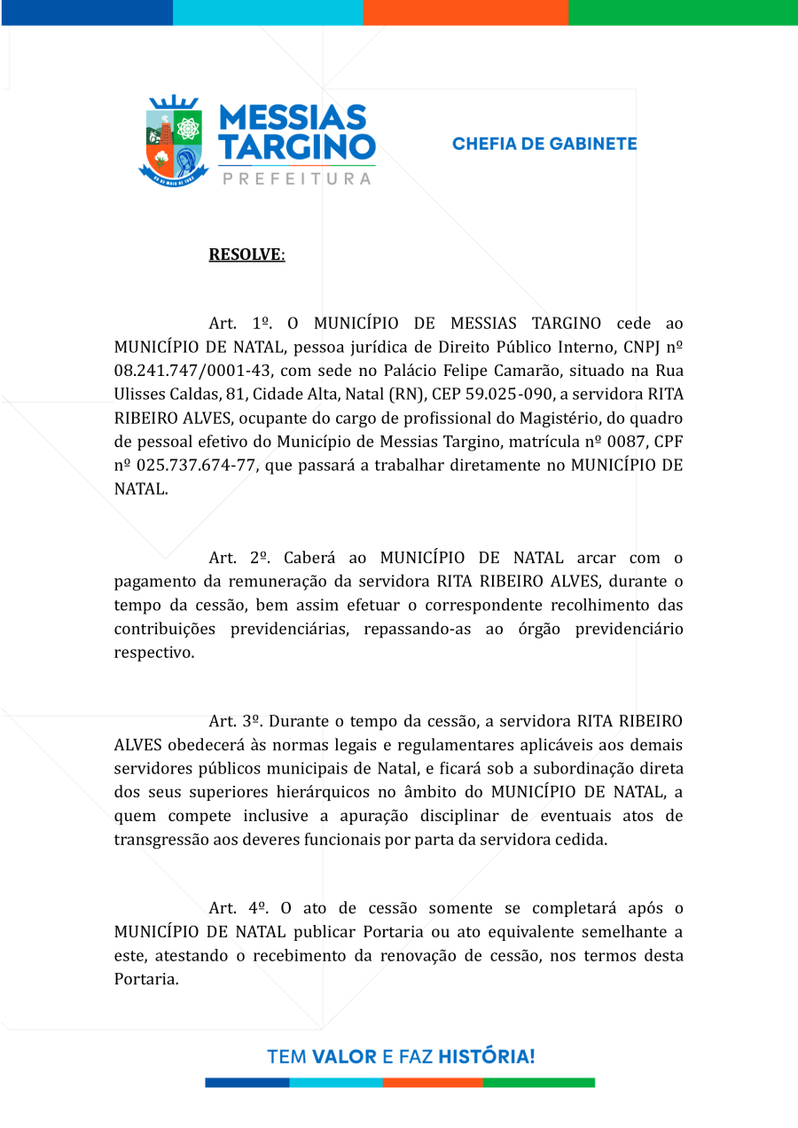Conforme MP n° 2.200-2 de 24/08/2001, que institui a infraestrutura de chaves Públicas. Matéria Publicada no Diário Oficial do Município de Messias Targino/RN no dia - Edição 01261.