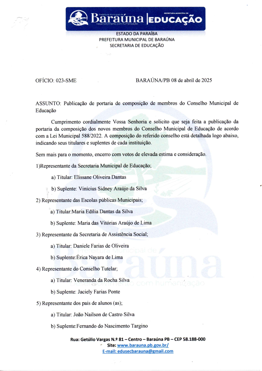 OFICIO Nº 23-SME - COMPOSIÇÃO DE NOVOS MEMBROS DO CONSELHO MUNICIPAL DE EDUCAÇÃO. - 08 DE ABRIL DE 2025.