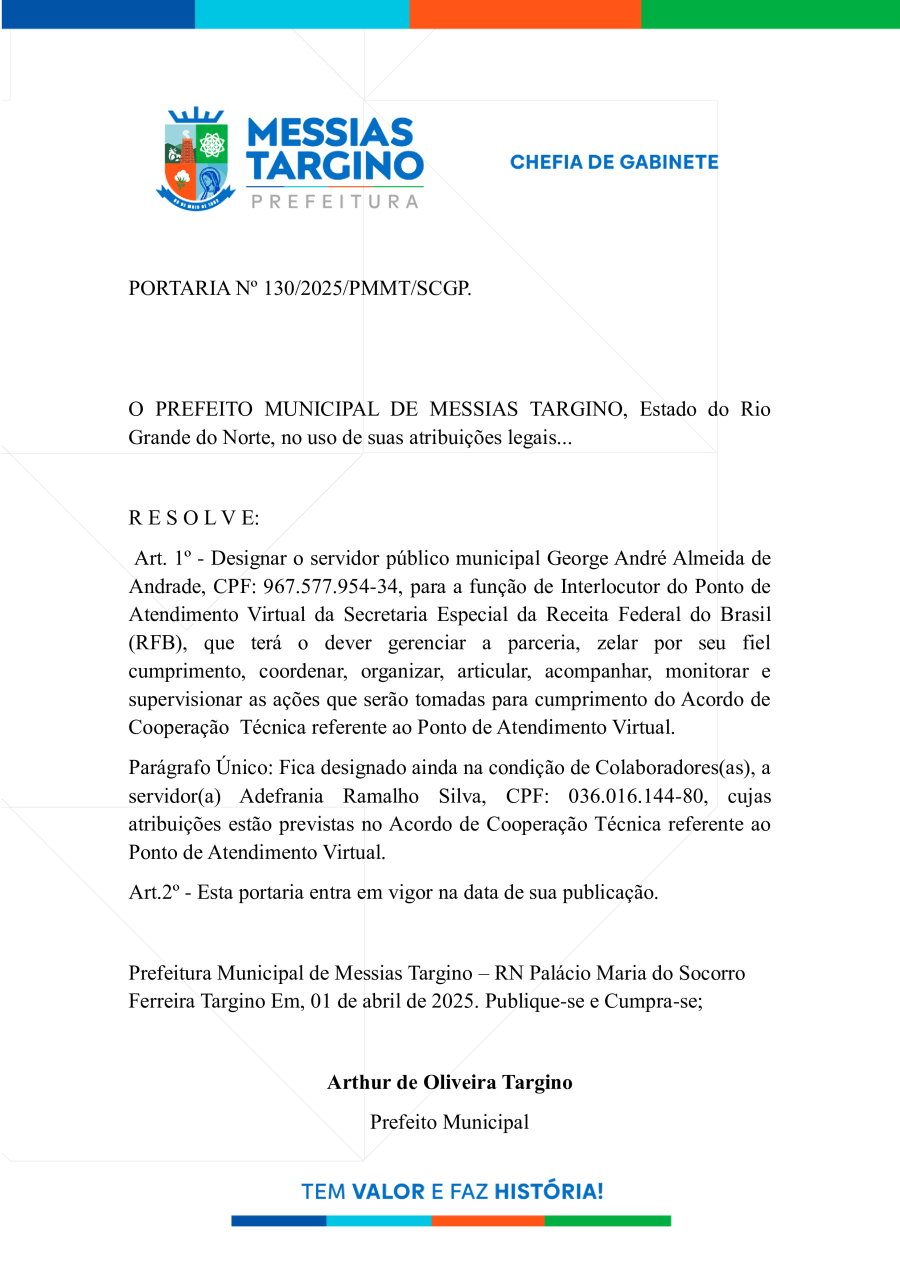 Conforme MP n° 2.200-2 de 24/08/2001, que institui a infraestrutura de chaves Públicas. Matéria Publicada no Diário Oficial do Município de Messias Targino/RN no dia - Edição 01263.