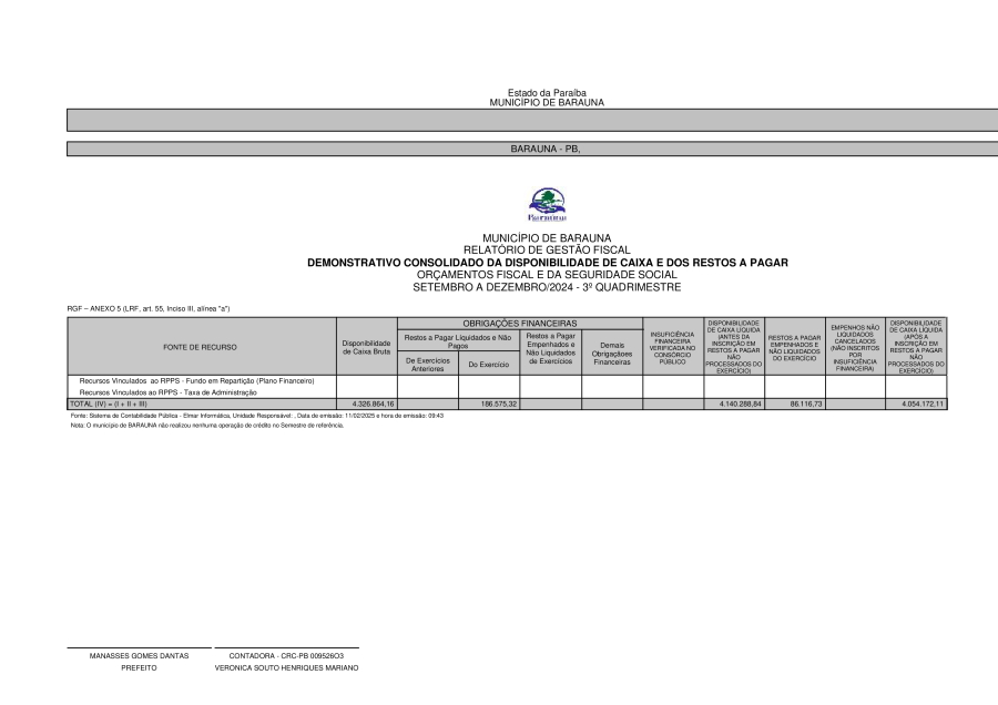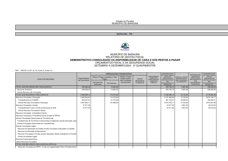 ANEXO 5 RGF - DEMONSTRATIVO CONSOLIDADO DA DISPONIBILIDADE DE CAIXA E DOS RESTOS A PAGAR. - 09 DE ABRIL DE 2025.