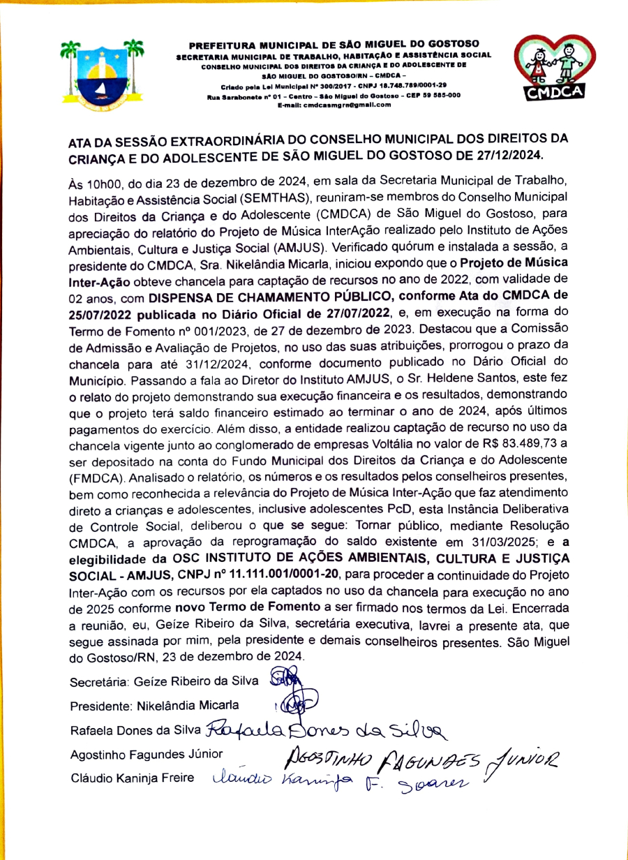 ATA DA SESSÃO EXTRAORDINÁRIA DO CONSELHO MUNICIPAL DOS DIREITOS DA CRIANÇAE DO ADOLESCENTE DE SAO MIGUEL DO GOSTOSO DE 27/12/2024.