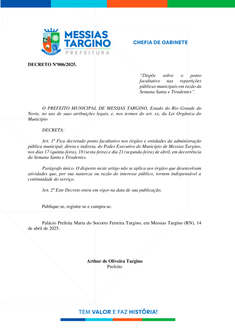 Conforme MP n° 2.200-2 de 24/08/2001, que institui a infraestrutura de chaves Públicas. Matéria Publicada no Diário Oficial do Município de Messias Targino/RN no dia - Edição 01267.