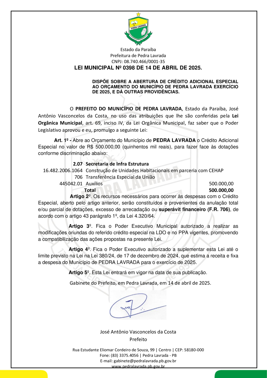 LEI N° 0398/2025 - DISPÕE SOBRE A ABERTURA DE CRÉDITO ADICIONAL ESPECIAL AO ORÇAMENTO DO MUNICÍPIO DE PEDRA LAVRADA EXERCÍCIO DE 2025