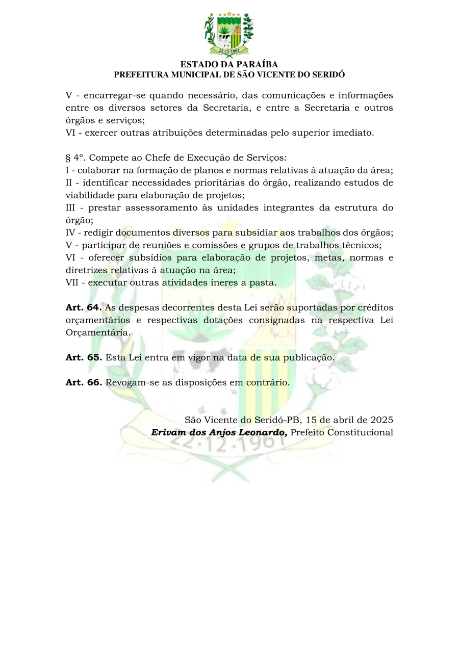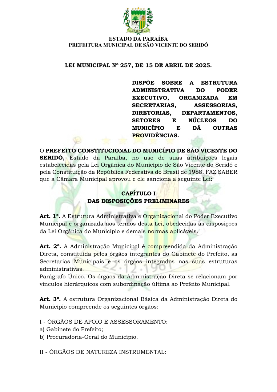 LEI MUNICIPAL Nº 257, DE 15 DE ABRIL DE 2025 - DISPÕE SOBRE A ESTRUTURA ADMINISTRATIVA DO PODER EXECUTIVO, ORGANIZADA EM SECRETARIAS, ASSESSORIAS, DIRETORIAS, DEPARTAMENTOS, SETORES E NÚCLEOS DO MUNICÍPIO E DÁ OUTRAS PROVIDÊNCIAS.