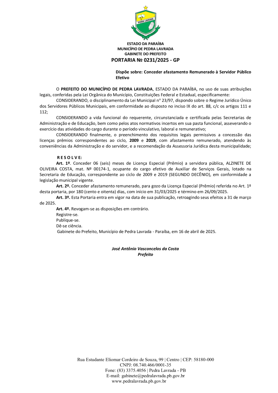 PORTARIA N° 0231/2025 - DISPÕE SOBRE CONCEDER AFASTAMENTO REMUNERADO À SERVIDOR