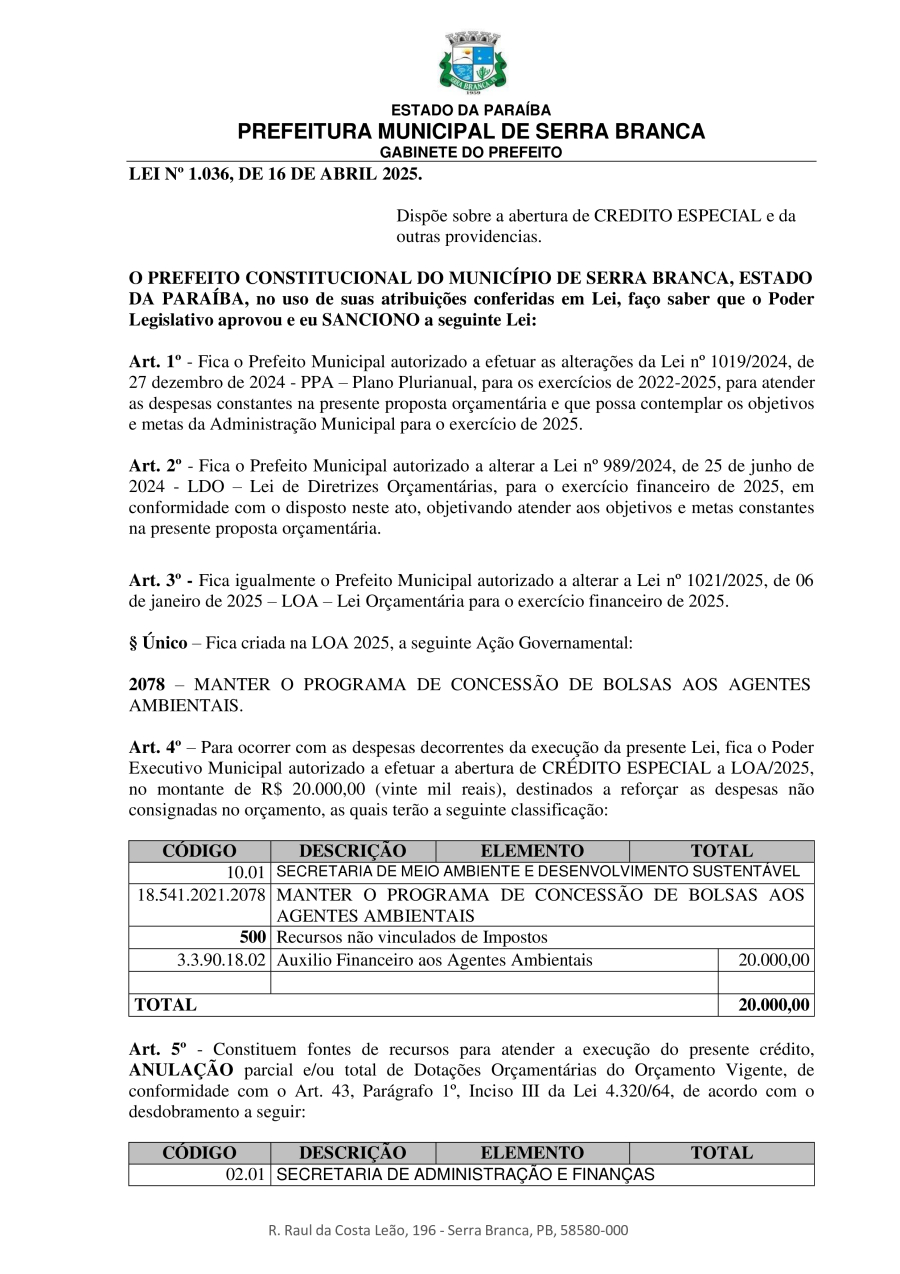 LEI N° 1036/2025 - DISPÕE SOBRE A ABERTURA DE CREDITO ESPECIAL