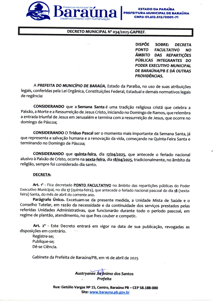 DECRETO Nº 034/2025-GAPREF. - DISPÕE SOBRE: DECRETA PONTO FACULTATIVO NO ÂMBITO DAS REPARTIÇÕES PÚBLICAS INTEGRANTES DO PODER EXECUTIVO MUNICIPAL DE BARAÚNA/PB E DÁ OUTRAS PROVIDÊNCIAS. - 16 DE ABRIL DE 2025.