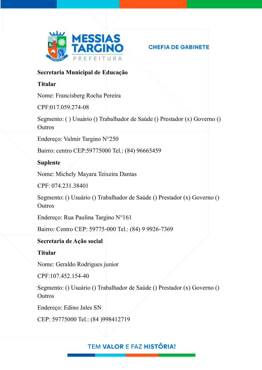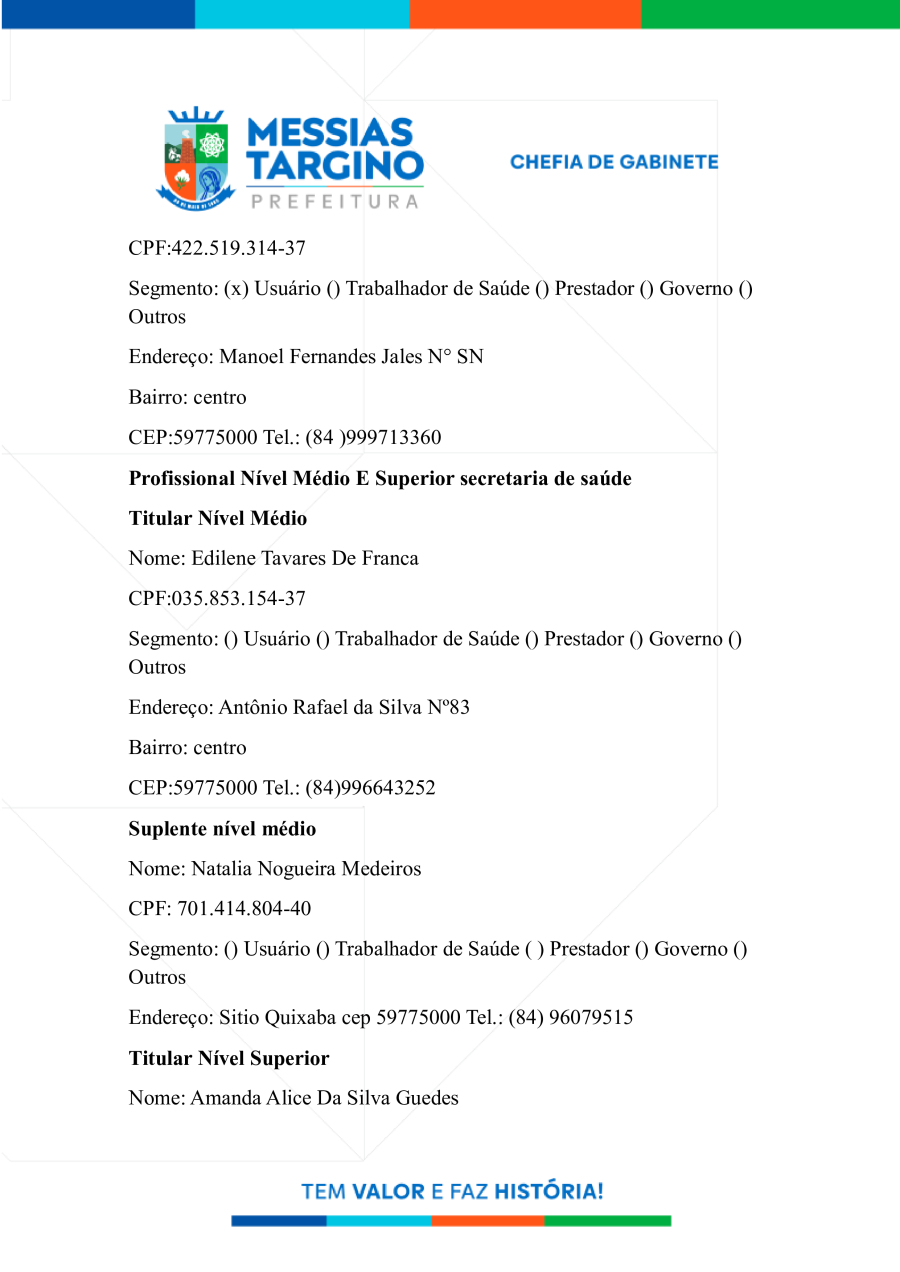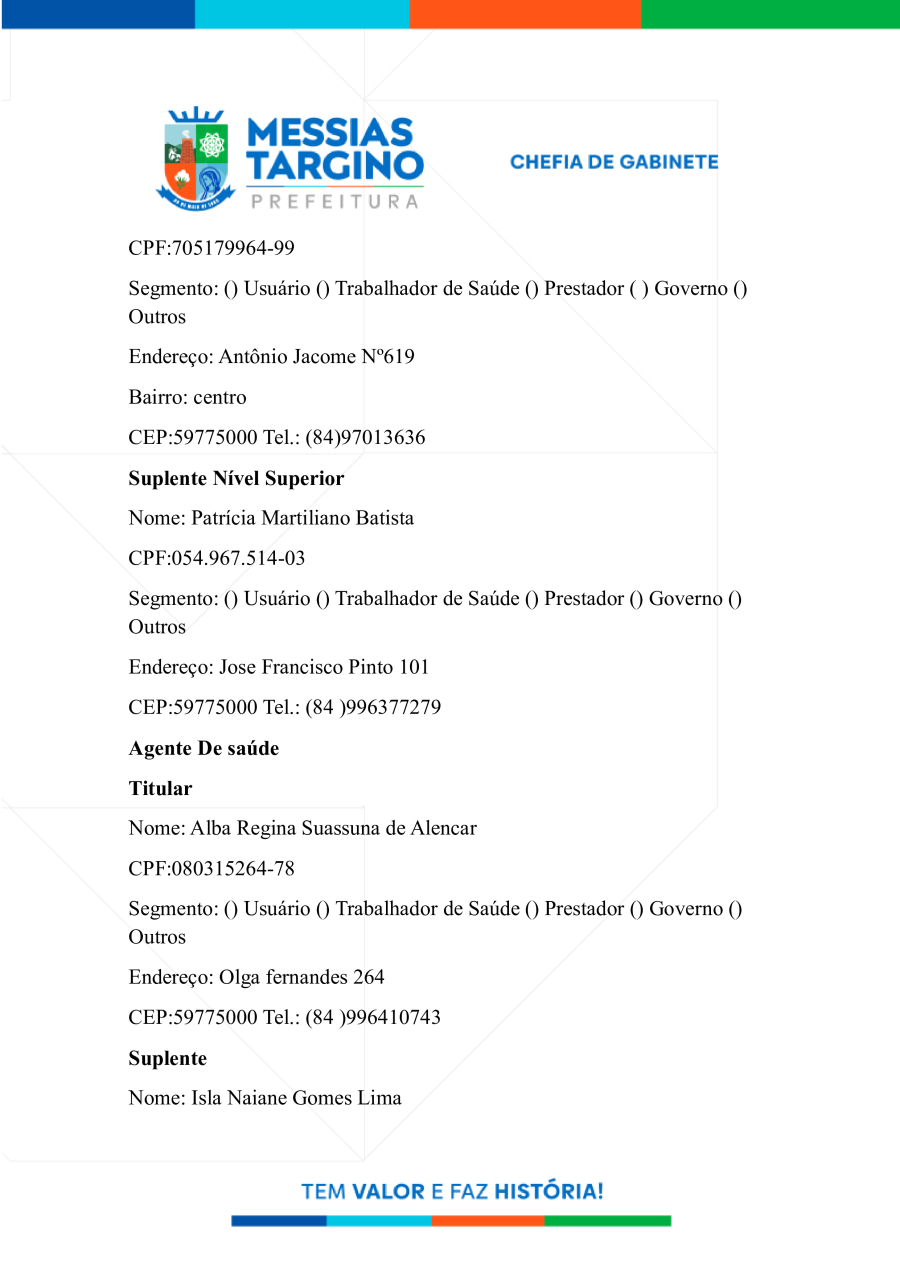 NOMEIA OS MEMBROS DO CONSELHO MUNICIPAL DE SAÚDE DE MESSIAS TARGINO.