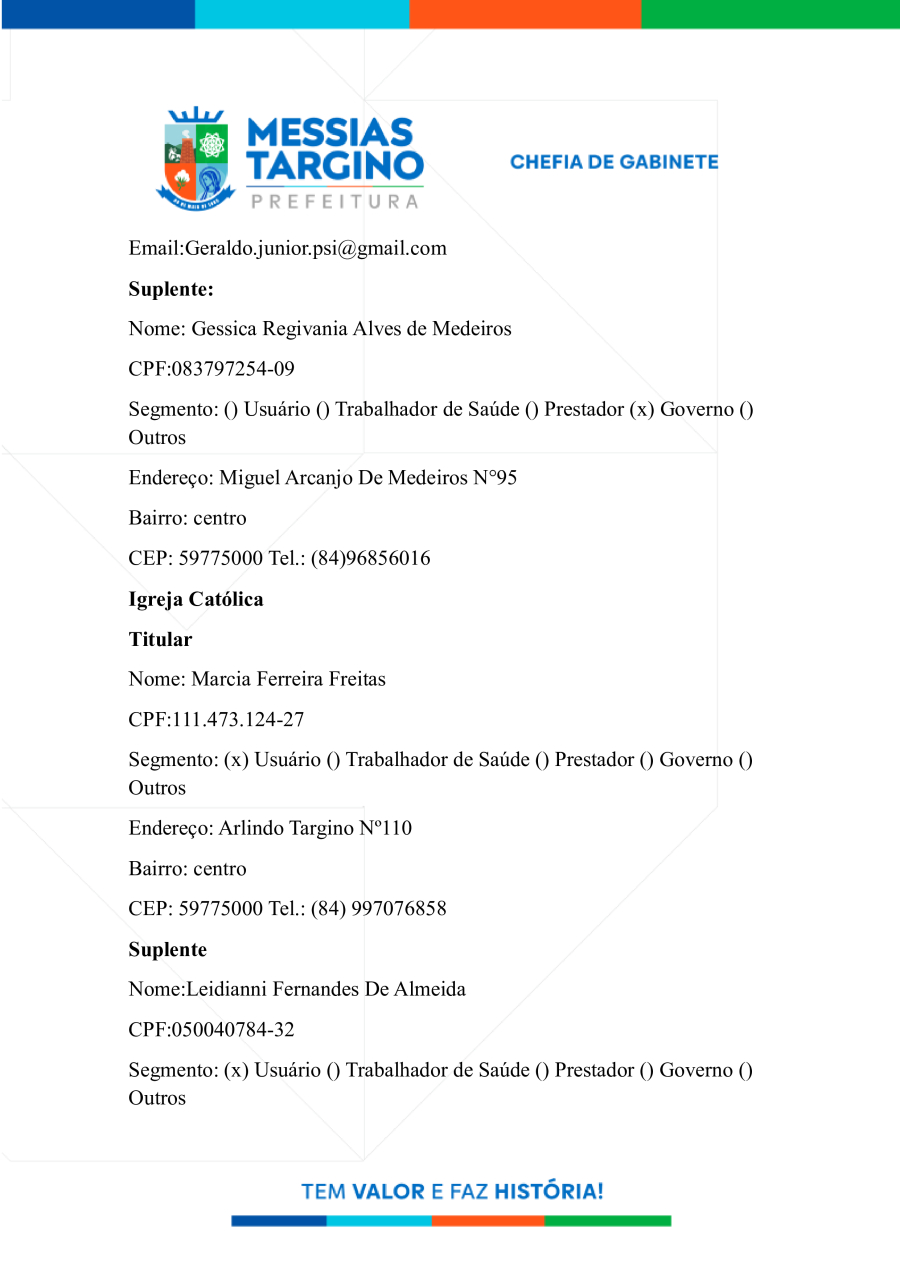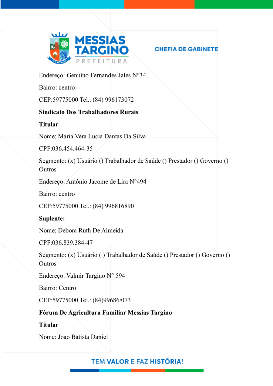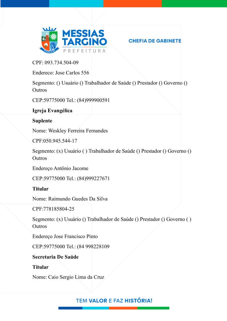 NOMEIA OS MEMBROS DO CONSELHO MUNICIPAL DE SAÚDE DE MESSIAS TARGINO.