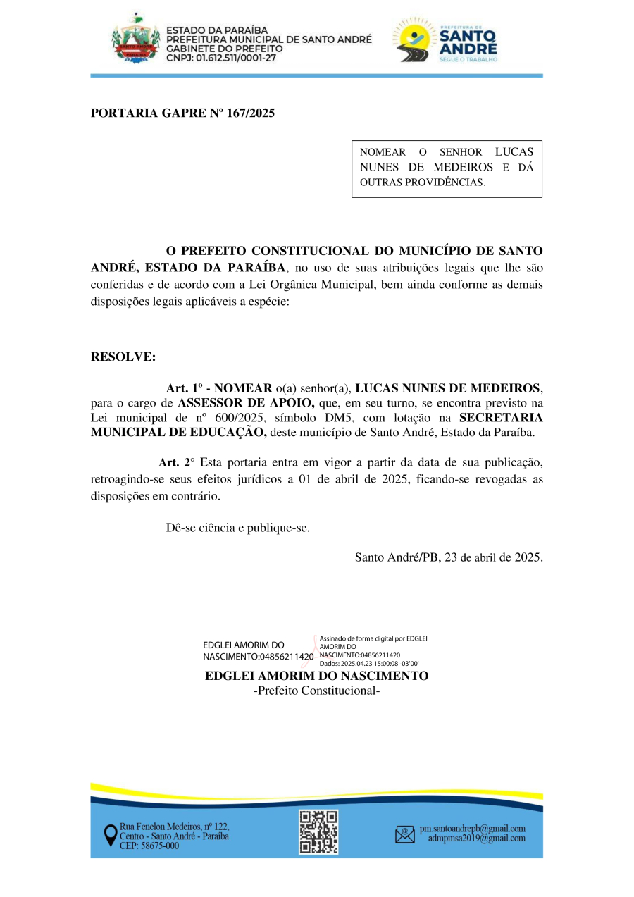 PORTARIA GAPRE Nº 167/2025 - NOMEAR O SENHOR LUCAS NUNES DE MEDEIROS E DÁ OUTRAS PROVIDÊNCIAS.