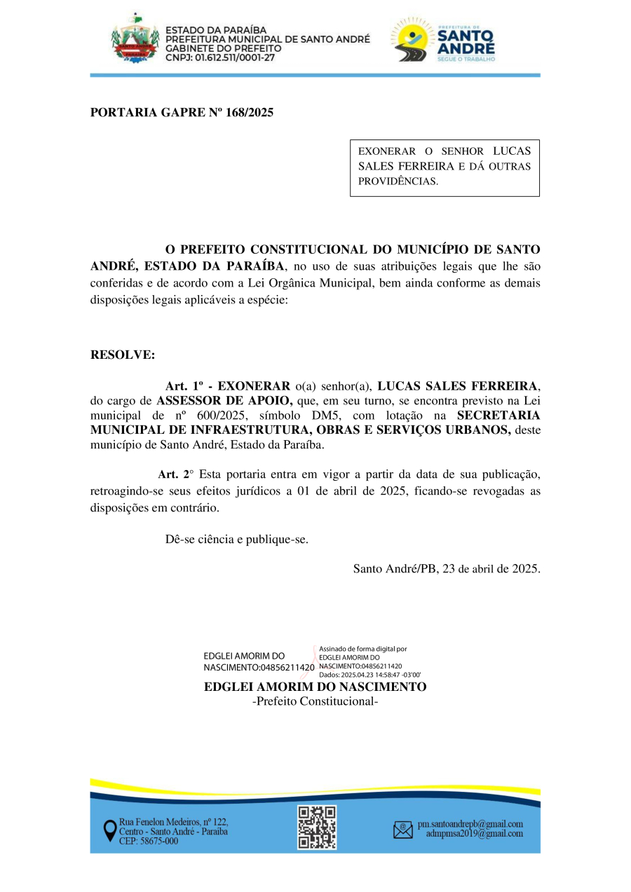 PORTARIA GAPRE Nº 168/2025 - EXONERAR O SENHOR LUCAS SALES FERREIRA E DÁ OUTRAS PROVIDÊNCIAS.