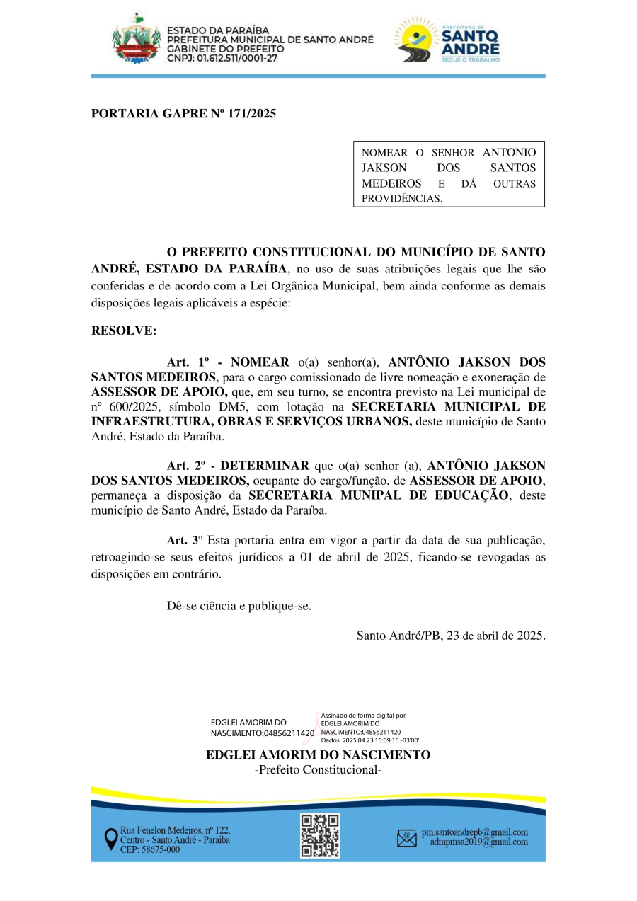 PORTARIA GAPRE Nº 171/2025 - NOMEAR O SENHOR ANTONIO JAKSON DOS SANTOS MEDEIROS E DÁ OUTRAS PROVIDÊNCIAS.