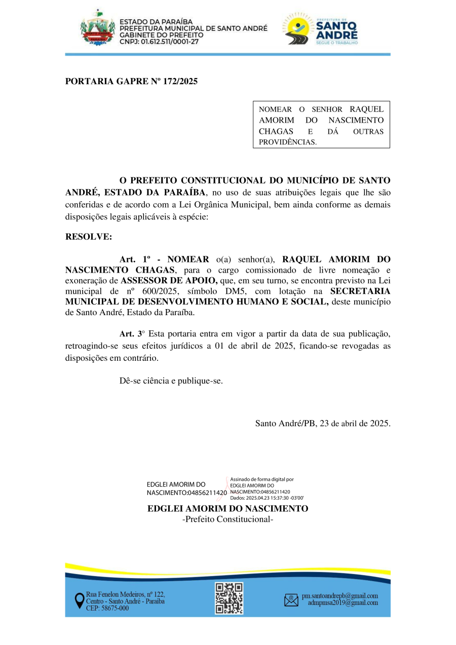 PORTARIA GAPRE Nº 172/2025 - NOMEAR O SENHOR RAQUEL AMORIM DO NASCIMENTO CHAGAS E DÁ OUTRAS PROVIDÊNCIAS