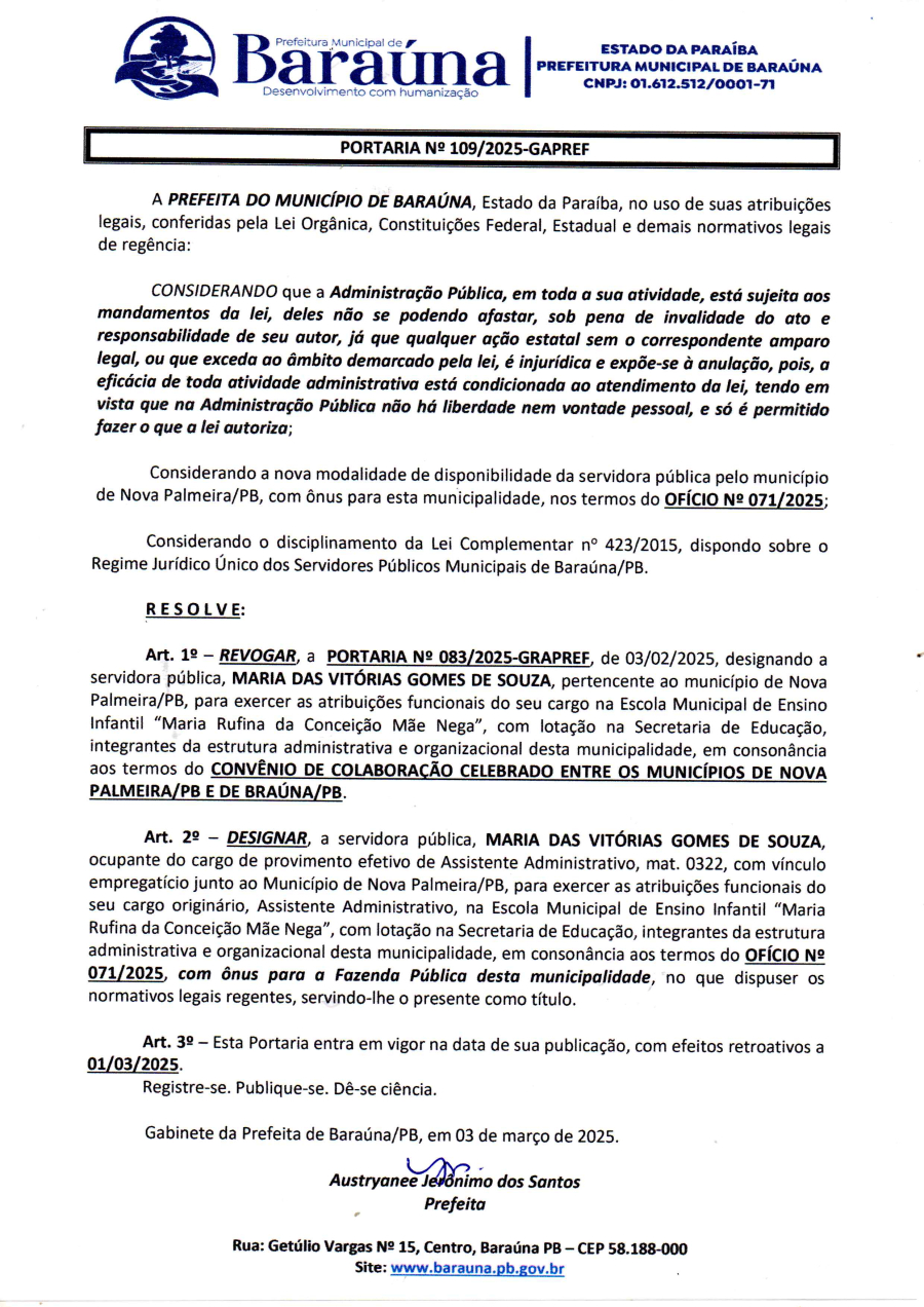 PORTARIA Nº 109/2025-GAPREF - REVOGAR A PORTARIA Nº 083/2025-GAPREF E DESIGNARA A SERVIDORA PÚBLICA MARIA DAS VITÓRIAS GOMES DE SOUZA. - 23 DE ABRIL DE 2025.