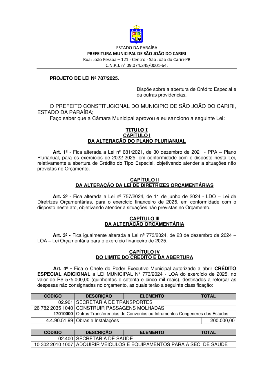 LEI 787/2025 - DISPÕE SOBRE A ABERTURA DE CRÉDITO ESPECIAL E DA OUTRAS PROVIDÊNCIAS