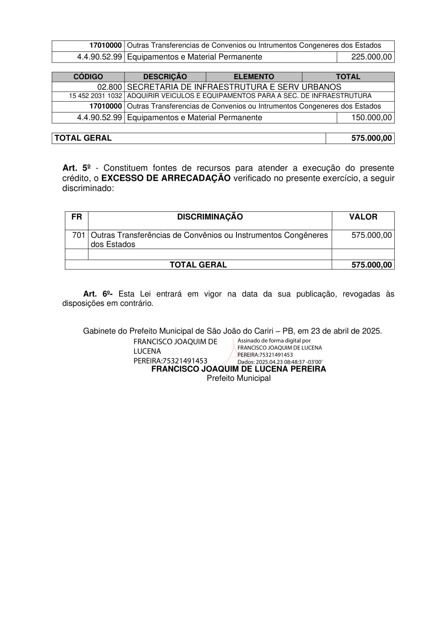 Conforme MP n° 2.200-2 de 24/08/2001, que institui a infraestrutura de chaves Públicas. Matéria Publicada no Diário Oficial do Município de São João do Cariri/PB no dia - Edição 01718.