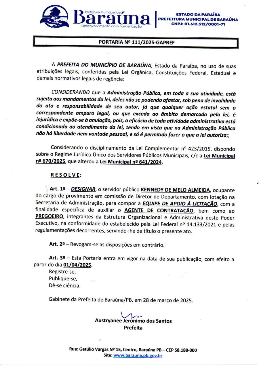 PORTARIA Nº 111/2025-GAPREF - DESIGNAR O SERVIDOR PÚBLICO KENNEDY DE MELO ALMEIDA, PARA COMPOR A EQUIPE DE APOIO A LICITAÇÃO. - 23 DE ABRIL DE 2025.