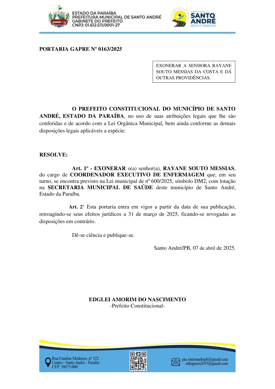 PORTARIA GAPRE Nº 0163/2025 - EXONERAR A SENHORA RAYANE SOUTO MESSIAS DA COSTA E DÁ OUTRAS PROVIDÊNCIAS.