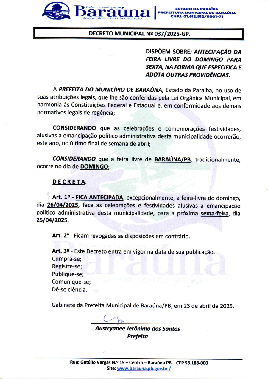 DECRETO Nº 037/2025-GP - DISPÕEM SOBRE: ANTECIPAÇÃO DA FEIRA LIVRE DO DOMINGO PARA SEXTA, NA FORMA QUE SEPECIFICA E ADOTA OUTRAS PROVIDÊNCIAS. - 23 DE ABRIL DE 2025.