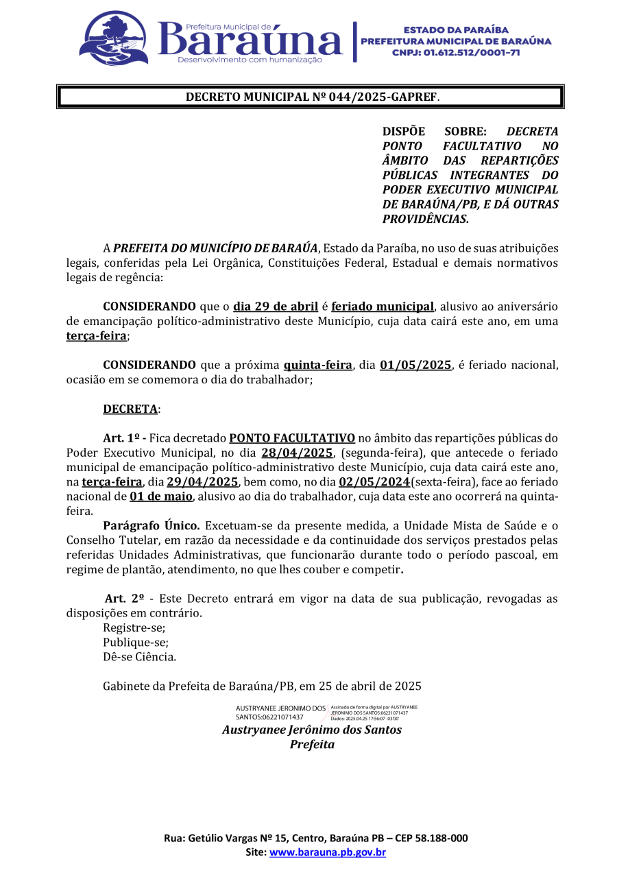 DECRETO MUNICIPAL Nº 044/2025-GAPREF. - DISPÕE SOBRE: DECRETA PONTO FACULTATIVO NO ÂMBITO DAS REPARTIÇÕES PÚBLICAS INTEGRANTES DO PODER EXECUTIVO MUNICIPAL DE BARAÚNA/PB, E DÁ OUTRAS PROVIDÊNCIAS. - 25 DE ABRIL DE 2025.