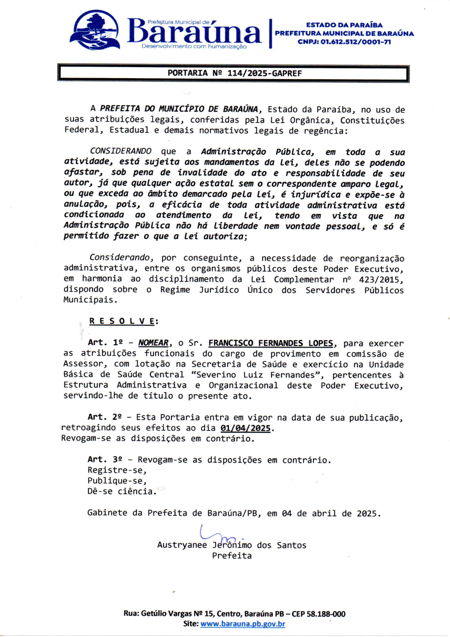 PORTARIA Nº 114/2025-GAPREF - NOMEAR O SR. FRANCISCO FERNANDES LOPES, PARA EXERCER AS ATRIBUIÇÕES FUNCIONAIS DO CARGO DE PROVIMENTO EM COMISSÃO DE ASSESSOR. - 30 DE ABRIL DE 2025.