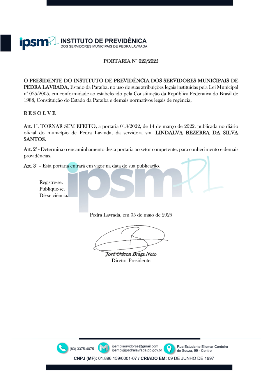 PORTARIA N° 0023/2025 - TORNAR SEM EFEITO A PORTARIA 0013/2022 DE 14 DE MARÇO DE 2022