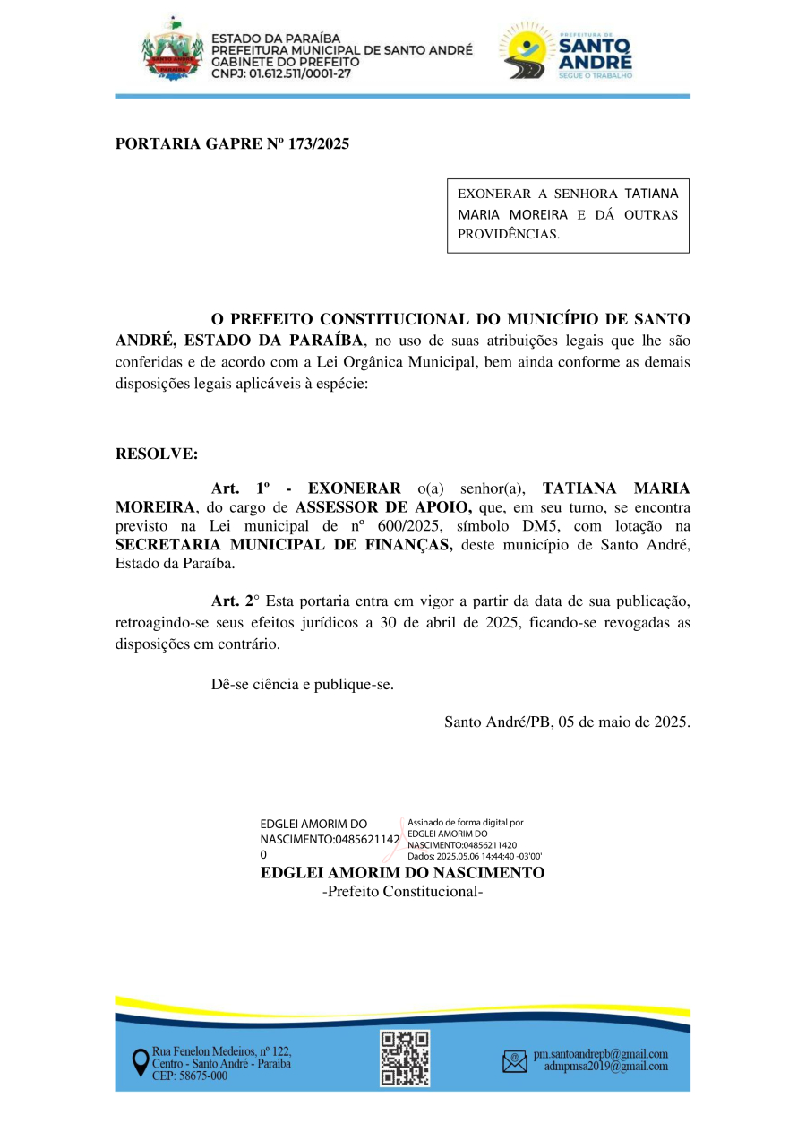 PORTARIA GAPRE Nº 173/2025 - EXONERAR A SENHORA TATIANA MARIA MOREIRA E DÁ OUTRAS PROVIDÊNCIAS.
