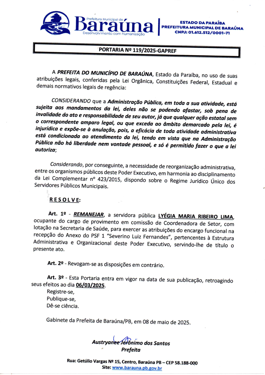 PORTARIA Nº 119/2025-GAPREF - REMANEJAR A SERVIDORA PÚBLICA LYÉGIA MARIA RIBEIRO LIMA. - 14 DE MAIO DE 2025.