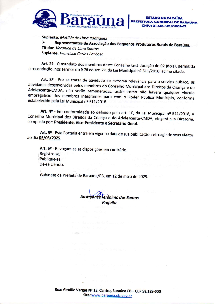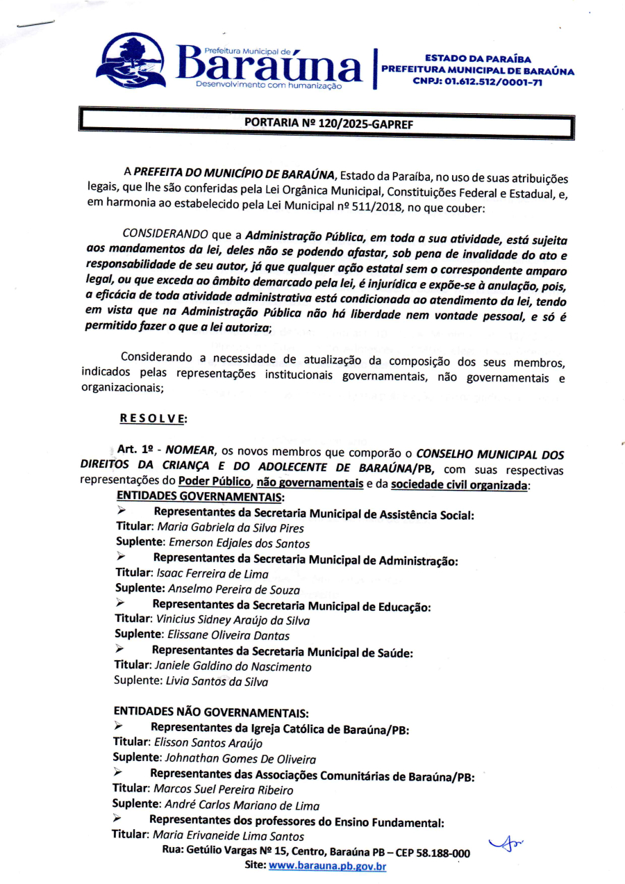 PORTARIA Nº 120/2025-GAPREF - NIMEAR OS NOVOS MEMBRIS DO CONSELHO MUNIICPAL DOS DIREITOS DA CRIANÇA E DO ADOLESCENTE DE BARAÚNA-PB. - 14 DE MAIO DE 2025.