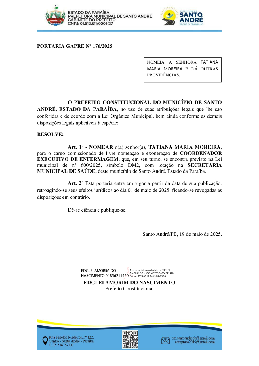 PORTARIA GAPRE Nº 176/2025 - NOMEIA A SENHORA TATIANA MARIA MOREIRA E DÁ OUTRAS PROVIDÊNCIAS.